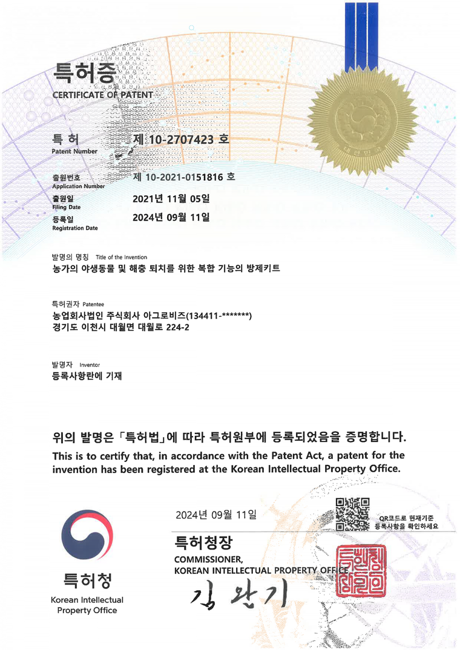 특허증(농가의 야생동물 및 해충 퇴치를 위한 복합 기능의 방제키트)