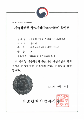 With these achievements and landmark successes, Agrobiz has been recognized as a technology-innovative small business (Innobiz) and a venture company.