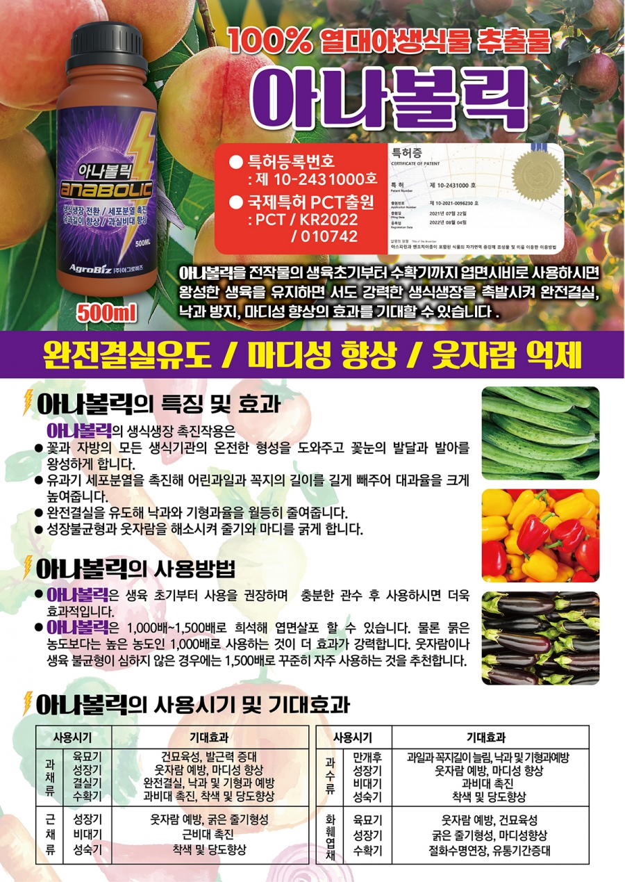 식물체 발효 부산물제제인 아나볼릭은 좋지 않은 환경과 병충해 등 각종 장해발생 상황에서도 식물의 대사능력을 높여 더 왕성한 생장으로 수확물의 품질과 수량을 월등히 향상시켜 줍니다.