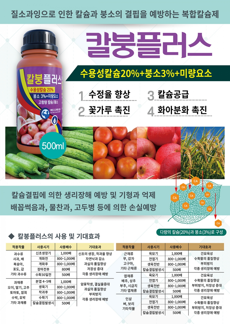 칼붕플러스는 질소과잉으로 인한 칼슘과 붕소의 결핍을 예방하는 복합칼슘제입니다.