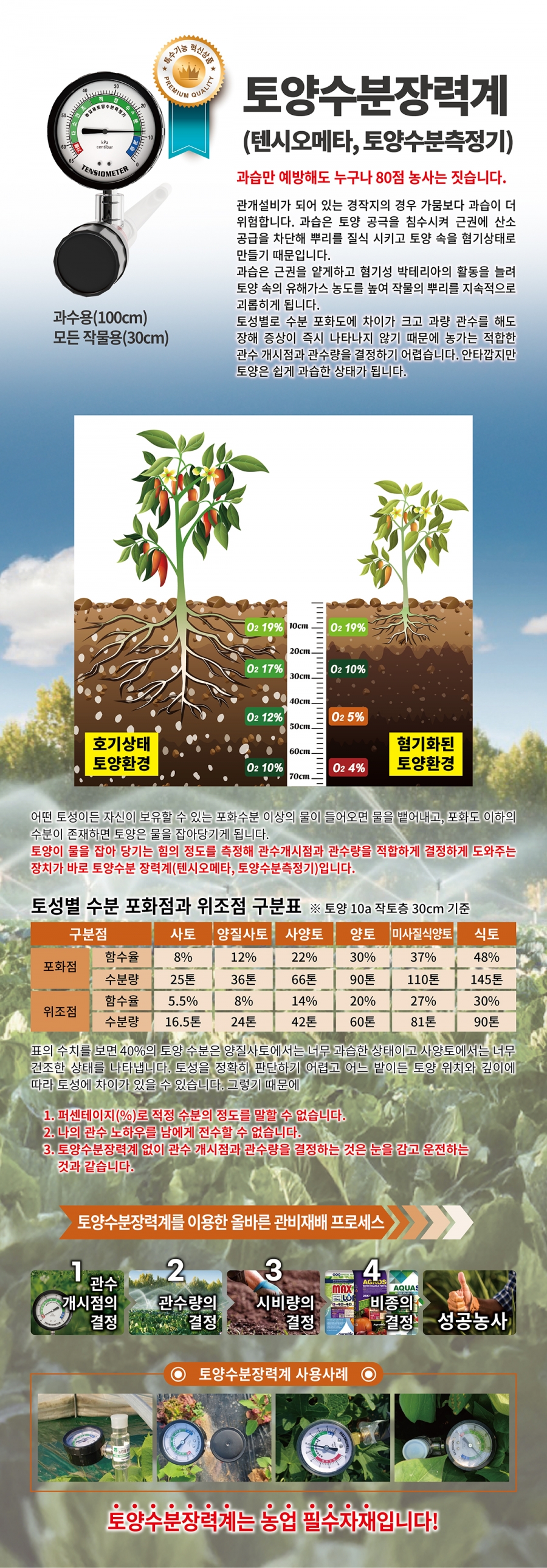 토양수분장력계는 과수용(100cm)과 모든 작물용(30cm)이 있습니다.