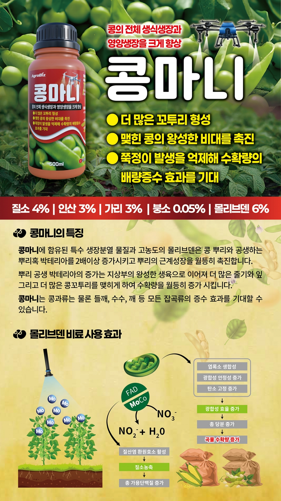 콩마니에 함유된 특수 생장분열 물질과 고농도의 몰리브덴은 콩 뿌리와 공생하는 뿌리혹 박테리아를 2배 이상 증가시키고 뿌리의 근계성장을 월등히 촉진합니다.
