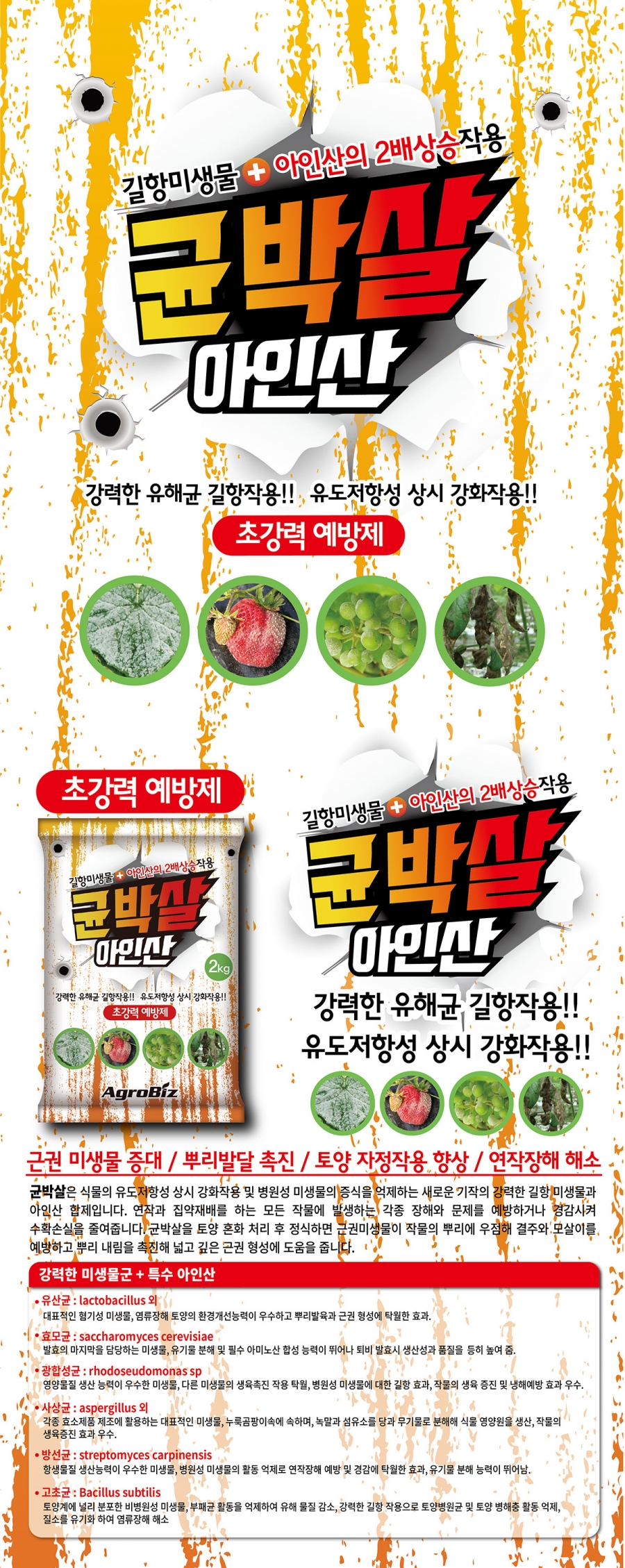 균박살은 식물의 유도저항성 상시 강화작용 및 병원성 미생물의 증식을 억제하는 새로운 기작의 강력한 길항 미생물과 아인산 합제입니다. 연작과 집약재배를 하는 모든 작물에 발생하는 각종 장해와 문제를 예방하거나 경감시켜 수확손실을 줄여줍니다. 균박살을 토양 혼화 처리 후 정식하면 근권미생물이 작물의 뿌리에 우점해 결주와 모살이를 예방하고 뿌리 내림을 촉진해 넓고 깊은 근권 형성에 도움을 줍니다.