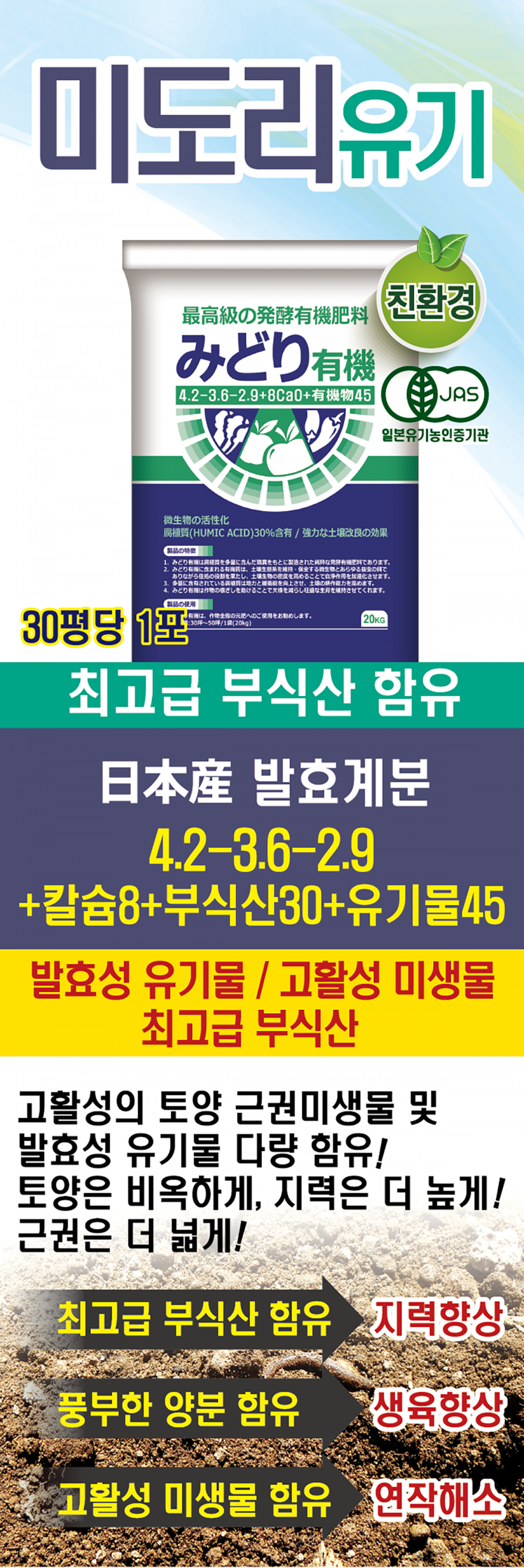 최고급 부식산이 지력을 높이고 토양을 풍성하게 하며 접종된 고활성 근권미생물이 토양 생물상을 복원하면 다량함유된 발효성 유기물이 토양생물들의 먹이가 되어 연작으로 악화된 토양 자정작용을 가속화합니다.