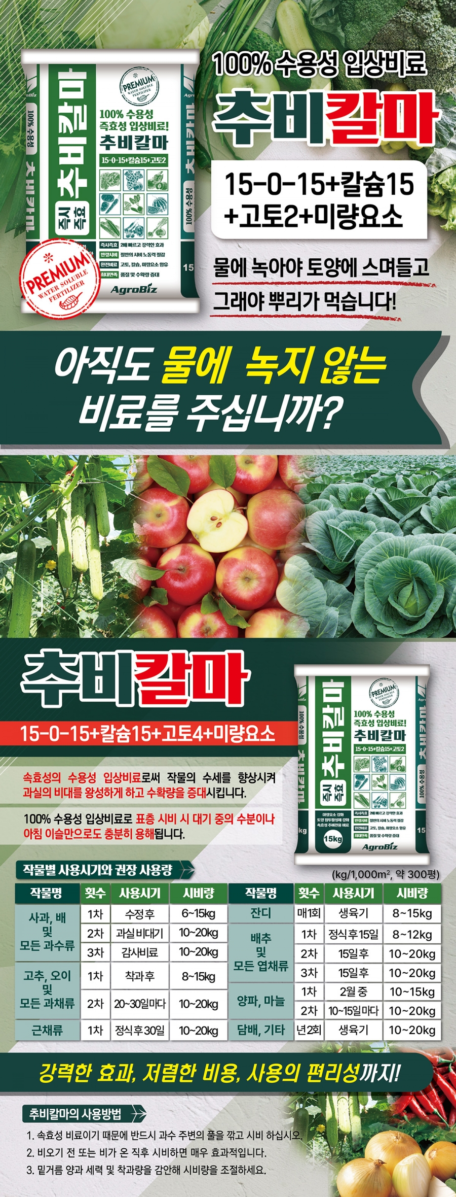 높은 효율성의 추비칼마은 1/2 감량 시비를 실현, 비용과 노동력을 줄여 경제성과 편리성을 높이고 용탈과 염류집적에 의한 환경오염과 연작장해를 예방하여 문제 발생을 줄이고 수확물의 품질과 수량을 증대시켜 줍니다. 추비칼마는 다량요소와 흡수이행성 칼슘 및 고토가 모두 보증되어 있어 작물의 수세유지와 과실 및 수확물의 품질향상, 장해예방의 효과가 있는 최고급의 고효율 추비 입니다.