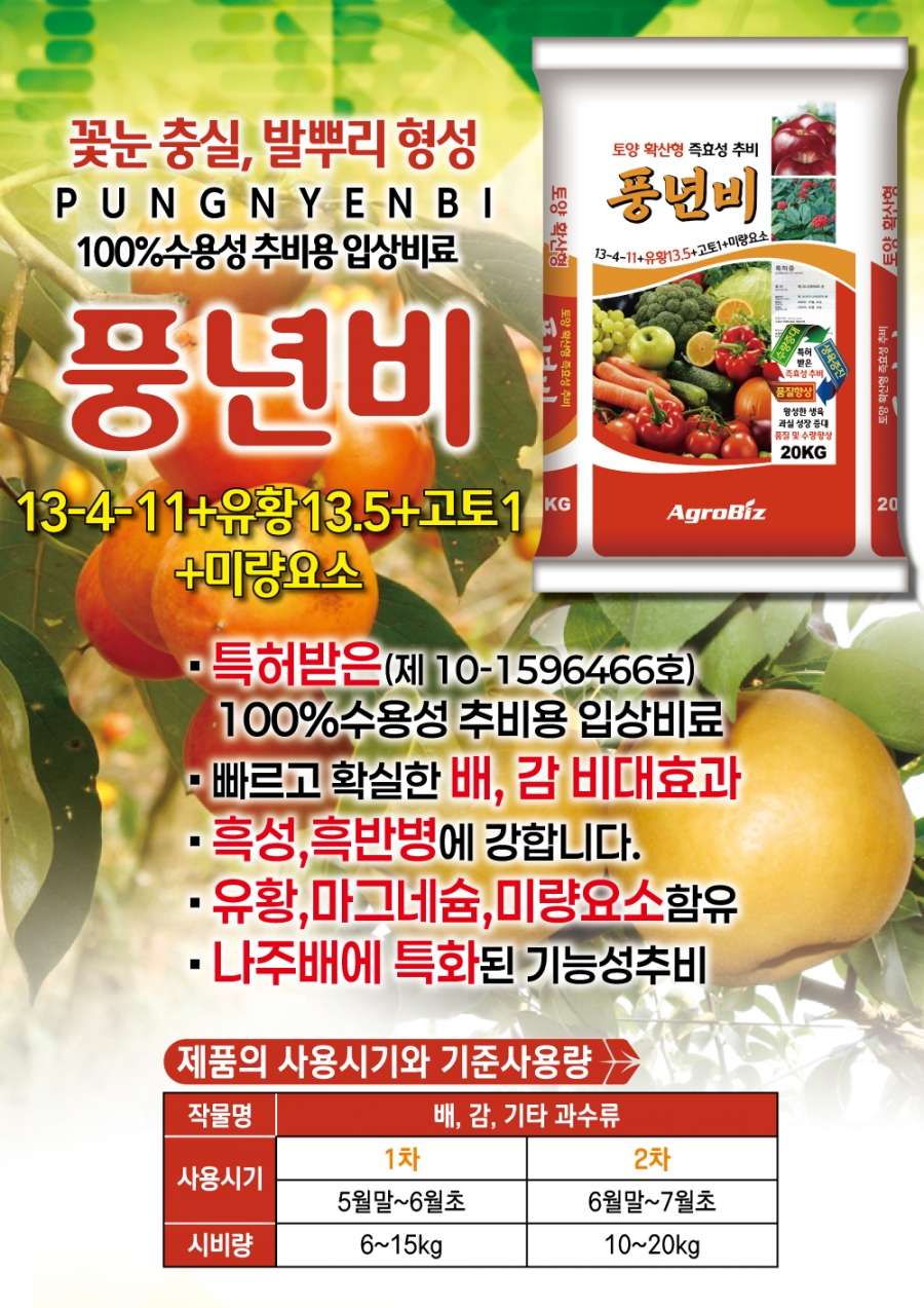 풍년비는 질소와 가리는 물론 고토와 미량요소 까지 등록사항으로 보증된 유일한 제품입니다. 무엇보다 수용성, 즉효성으로 비료로 소실은 차단하고 강력한 흡비력으로 효과는 뛰어납니다. 깔 당도 윤택까지 모두 해결할 수 있는 특허받은 완전추비입니다.