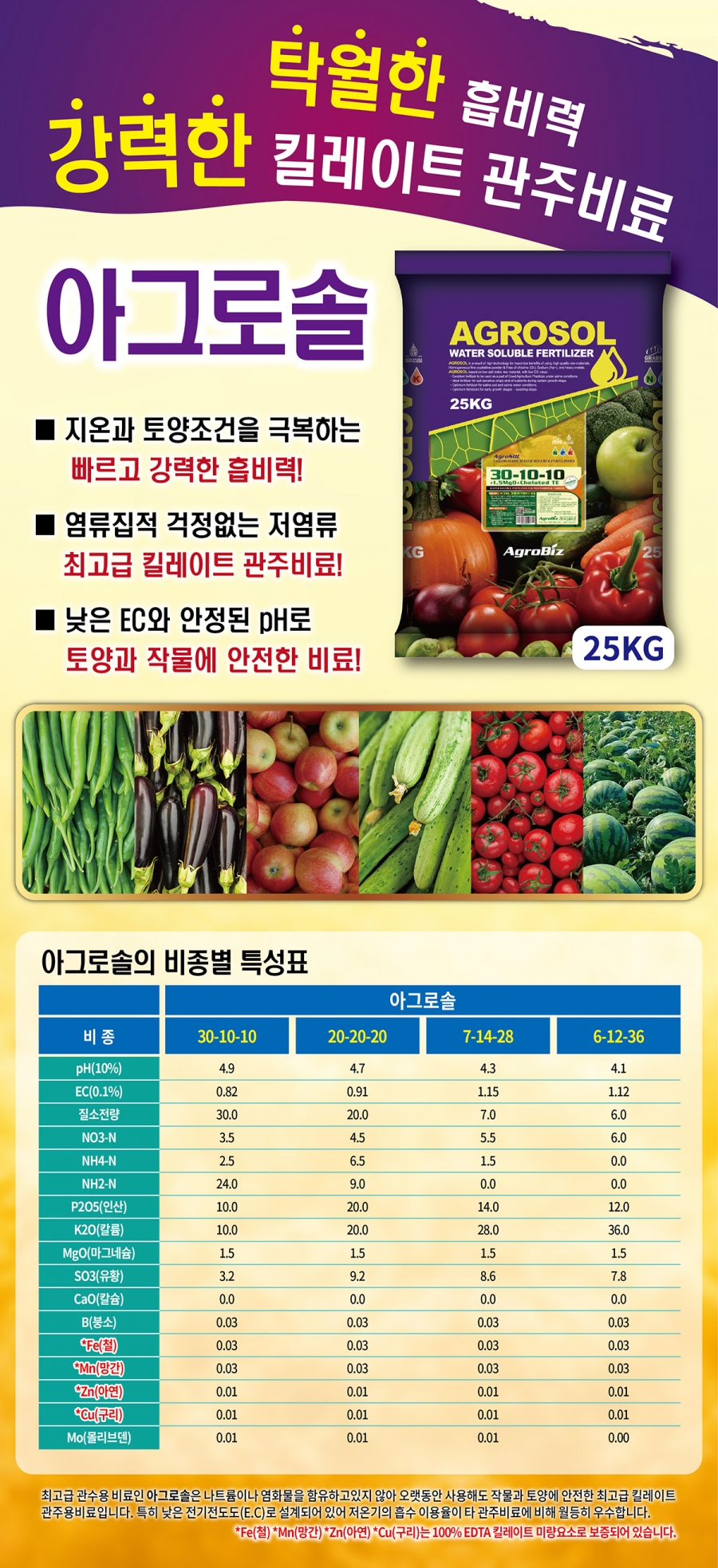 아그로솔은 모든 작물에 맞는 특화된 비종들로 100% 킬레이트 미량요소를 함유하고 있어 빠르고 강력한 흡수력으로 지온과 토양조건을 극복합니다. 그리고 낮은 EC와 안정된 pH로 토양과 작물에 안전합니다.