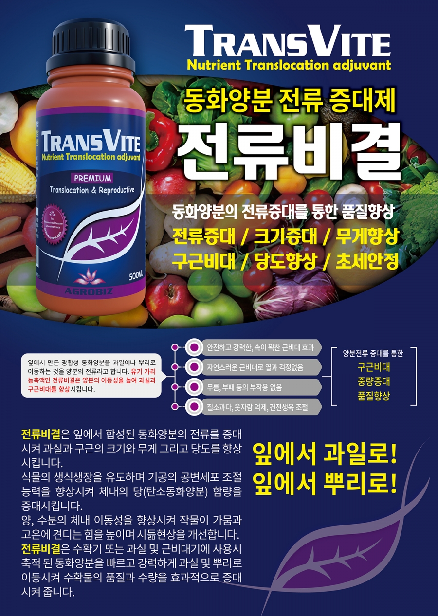 잎에서 만든 광합성 동화양분을 과일이나 뿌리로 이동하는 것을 양분의 전류라고 합니다. 유기 가리 농축액인 근이커와 전류비결은 양분의 이동성을 높여 과실과 구근비대를 향상시킵니다.