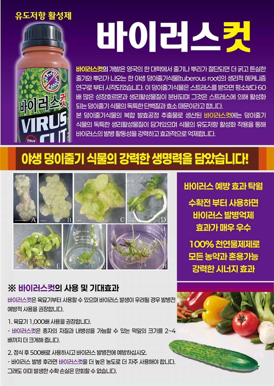 바이러스컷은 불의한 바이러스의 감염에서도 발병단계에 돌입하지 않도록 하는 작물 유도저항성 상시활성화제입니다.