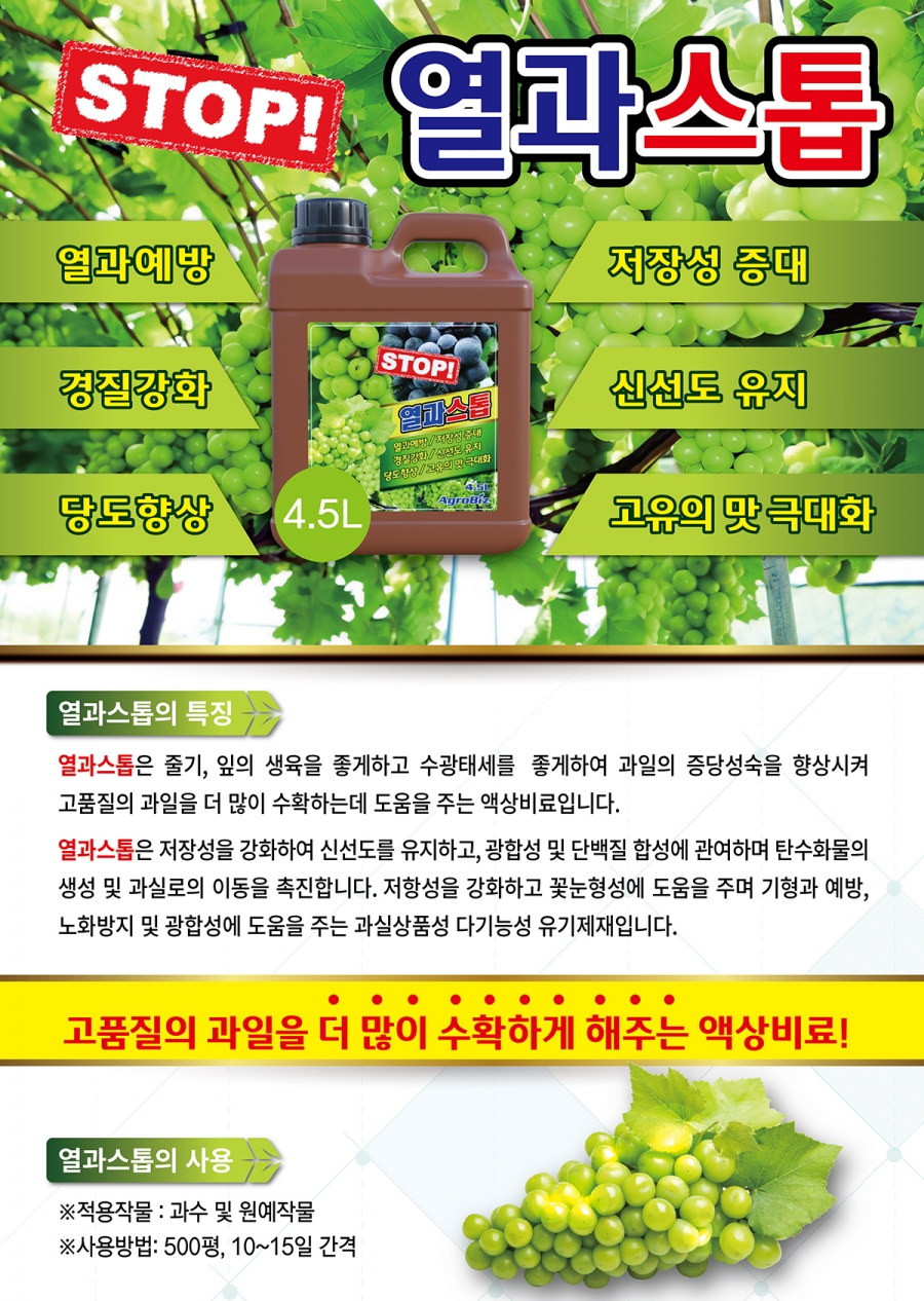 열과스톱은 줄기, 잎의 생육을 좋게하고 수광태세를 좋게하여 과일의 증당성숙을 향상시켜 고품질의 과일을 더 많이 수확하는데 도움을 주는 액상비료입니다.